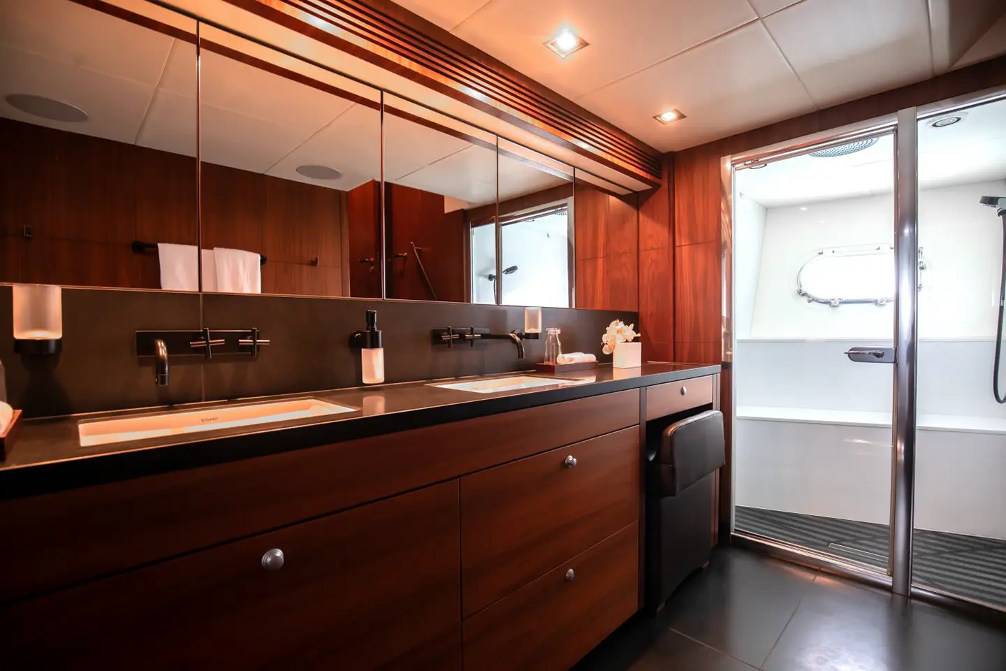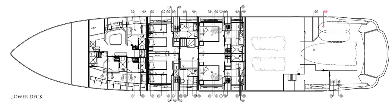 - Hlavní kajuta na hlavní palubě (celá šířka lodi, vlastní koupelna, šatna)