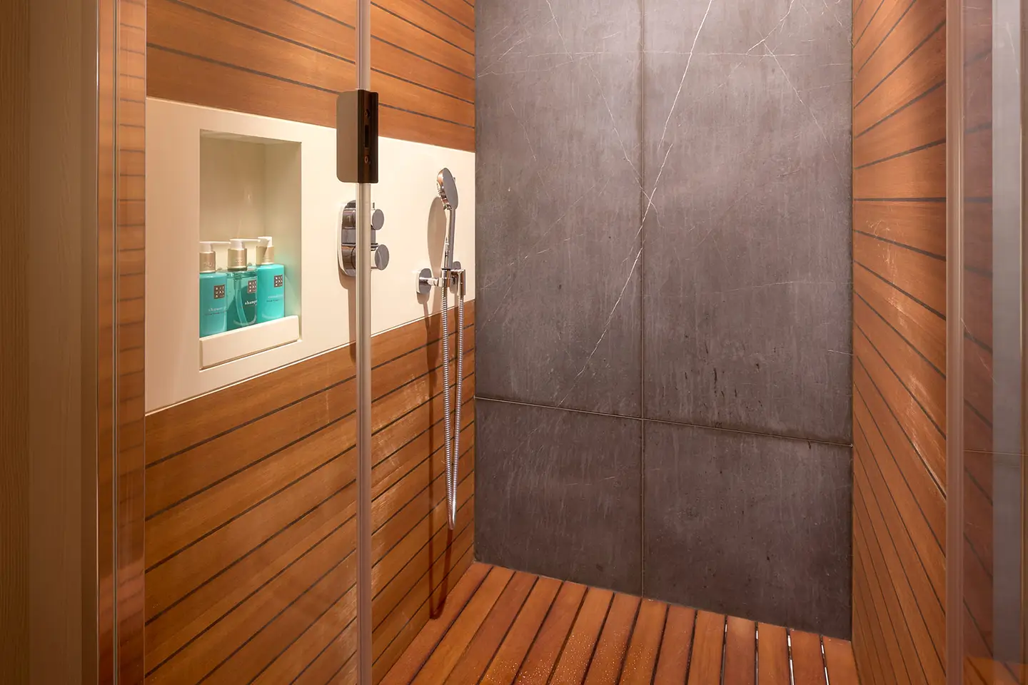 - Stěna sprchy v koupelně majitele z mramoru