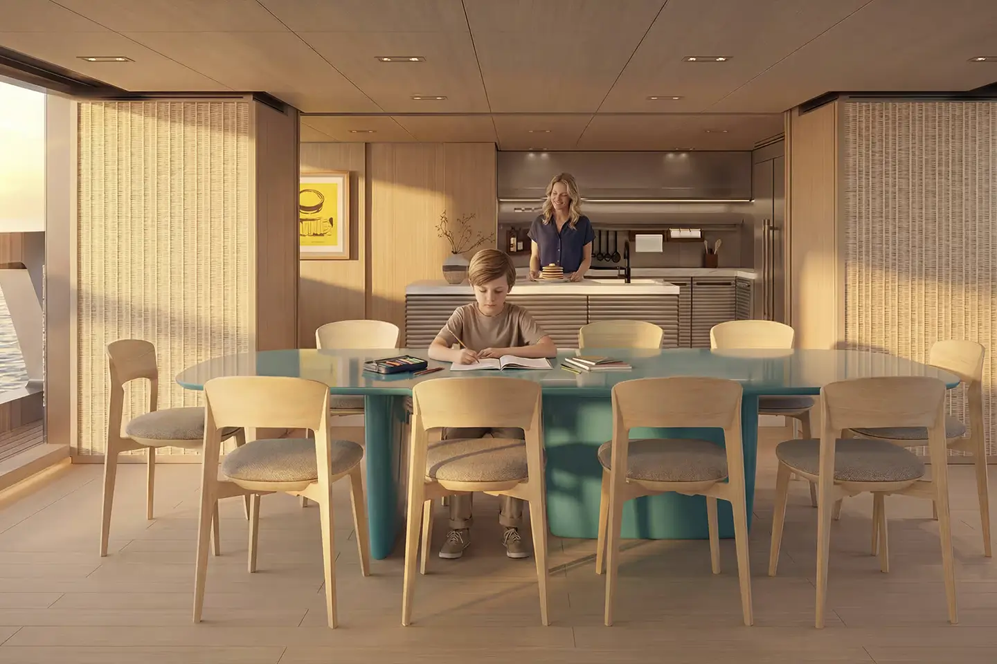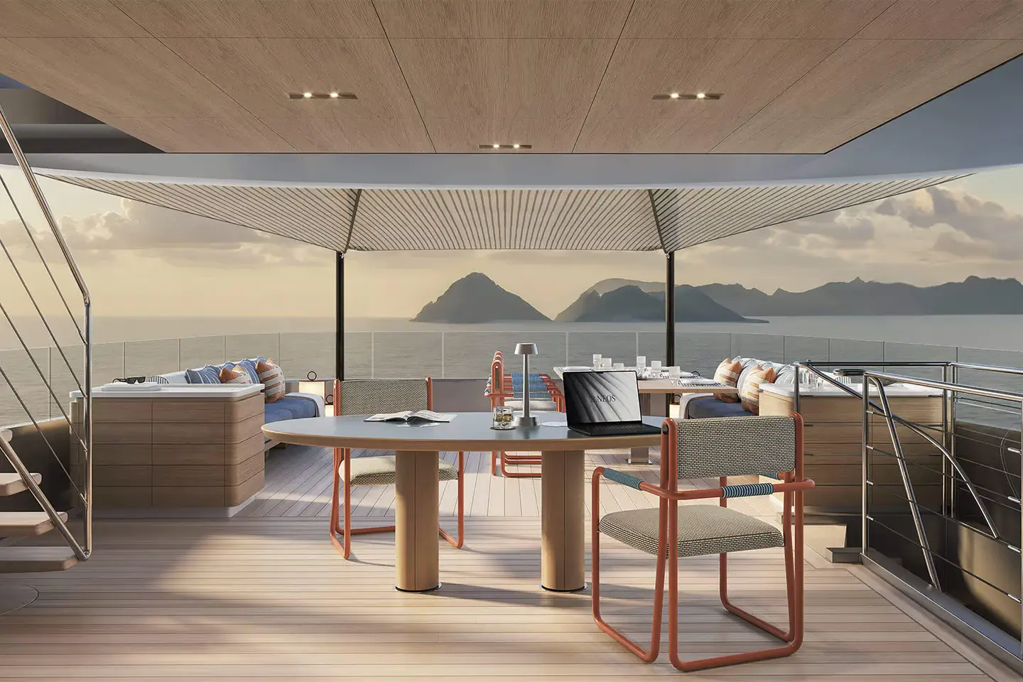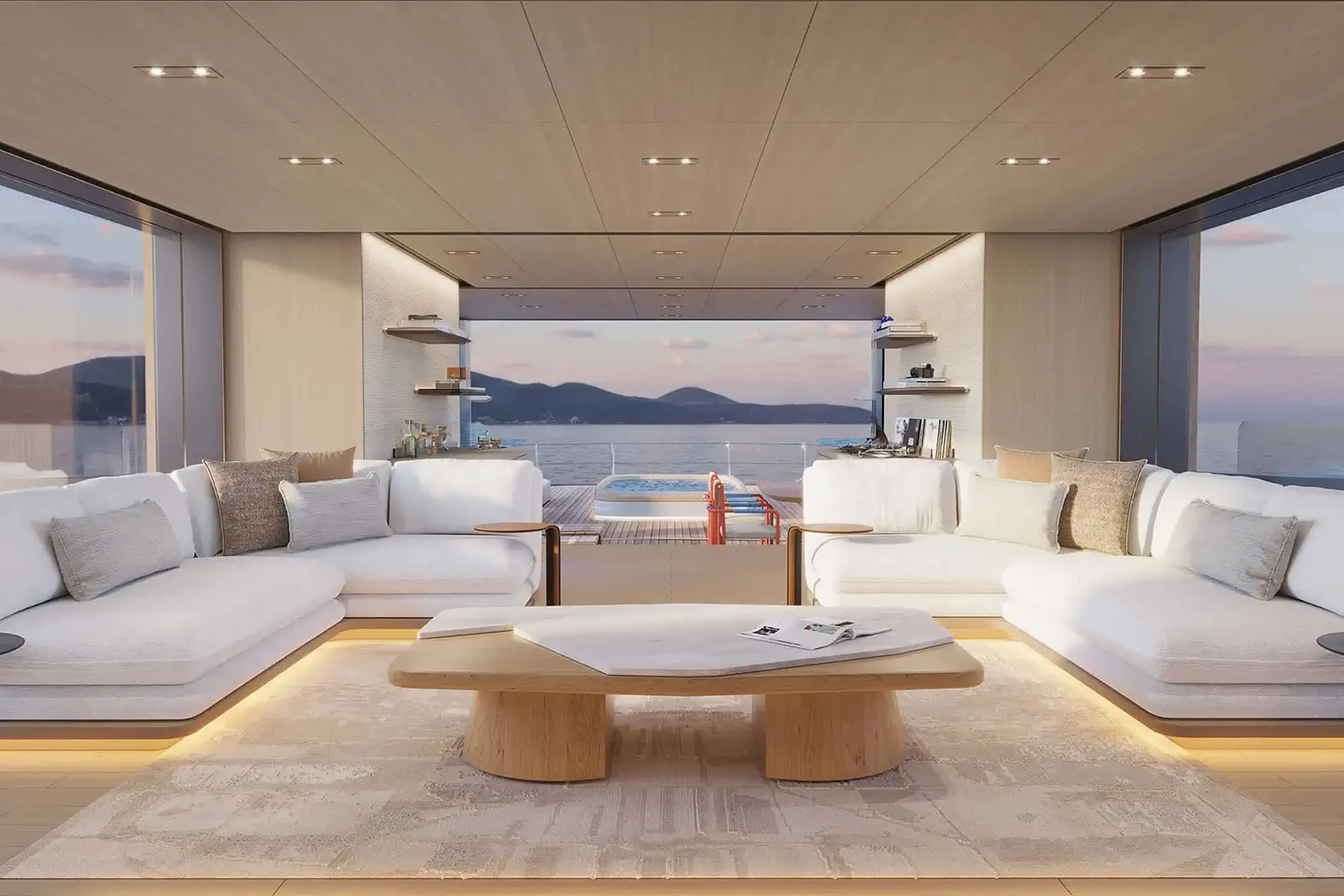 • Teakové paluby pokračují z exteriéru do interiéru a vytvářejí vizuální kontinuitu
