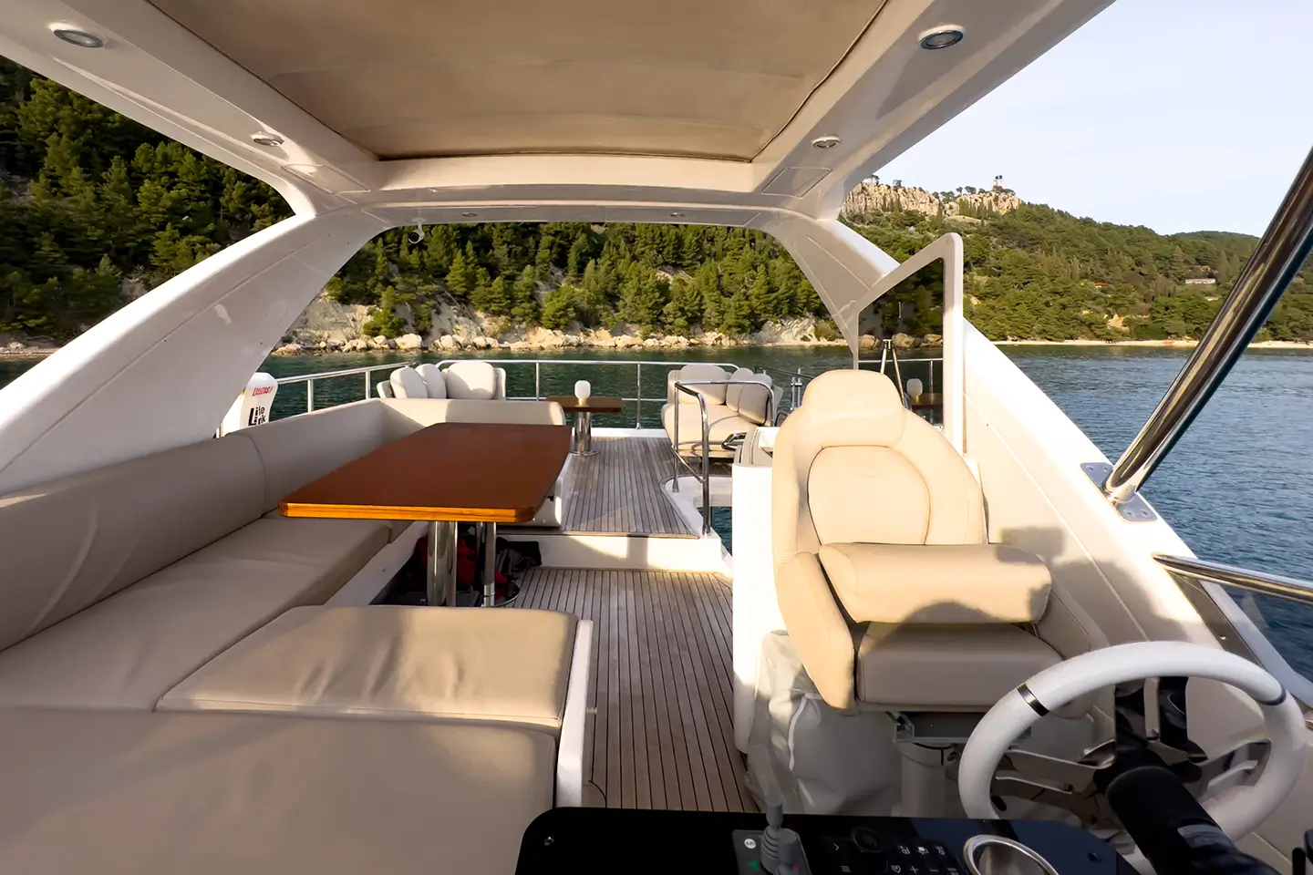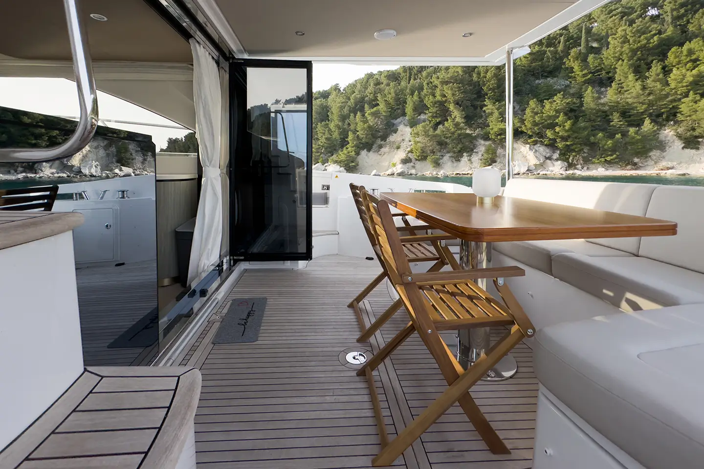 - Ležaljke na zadnjem dijelu flybridgea s dvije suprotne klupe u Batyline tkanini i stolom za kavu