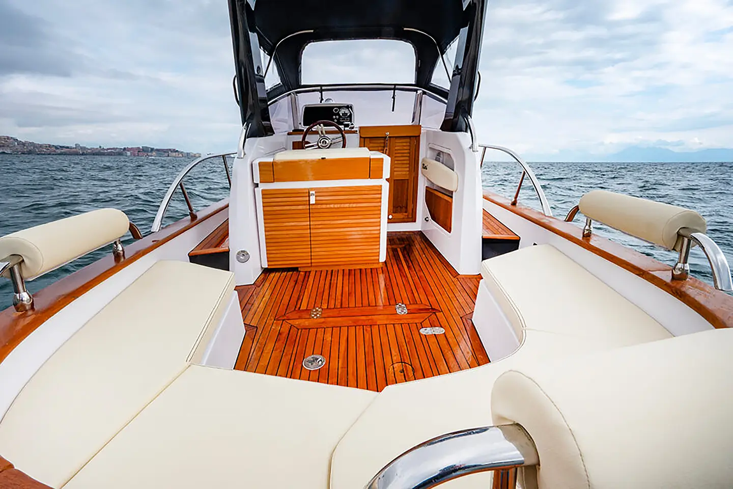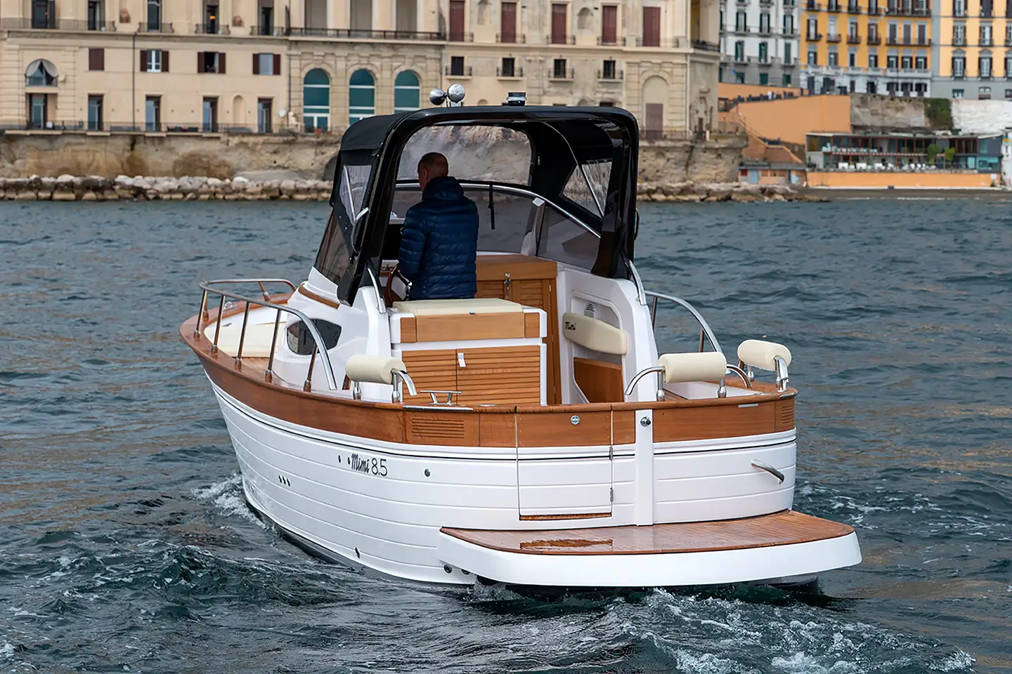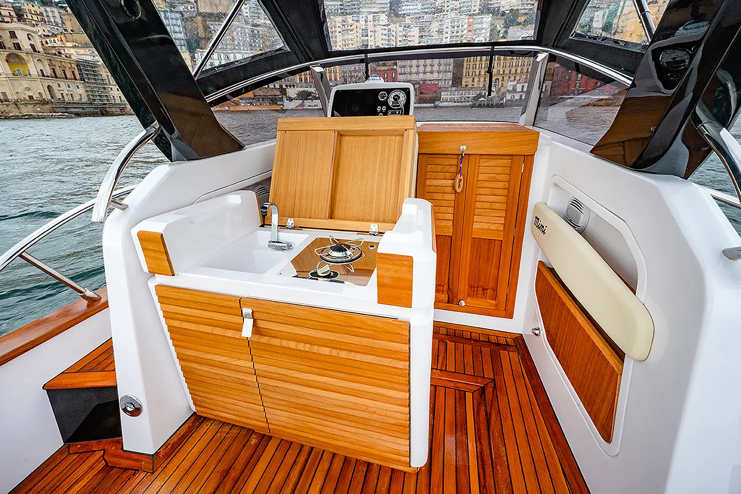 - Fina paluba od sezonski obrađenog masivnog tikovog drva u skladu s tradicijom Gozzi Mimì