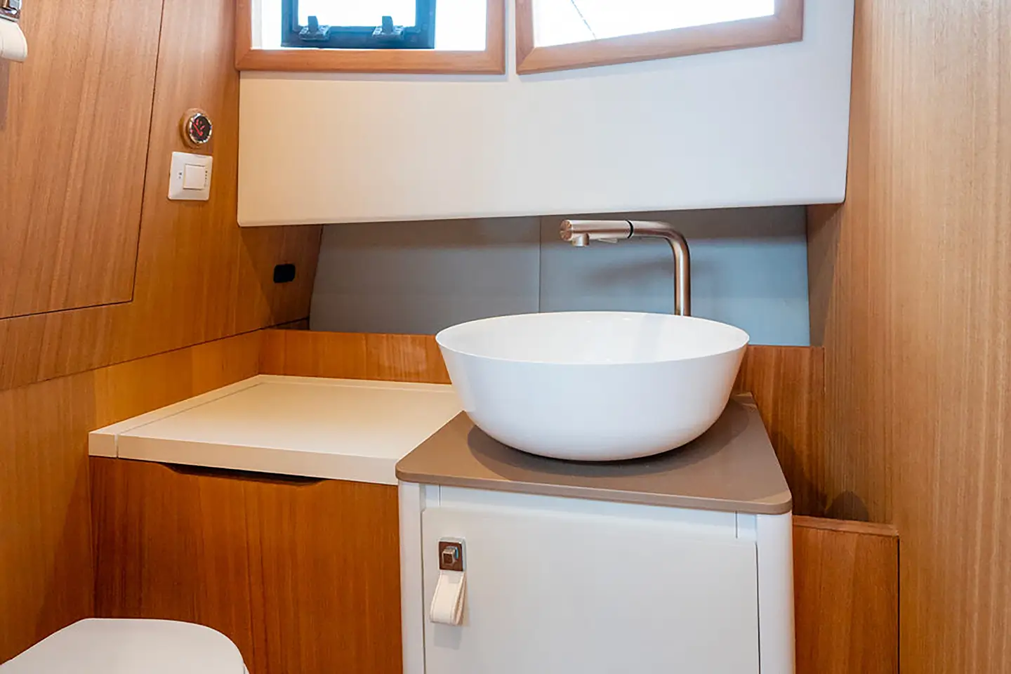 - Skrivena kuhinja ispod sjedala kormila s umivaonikom, kuhalom i hladnjakom