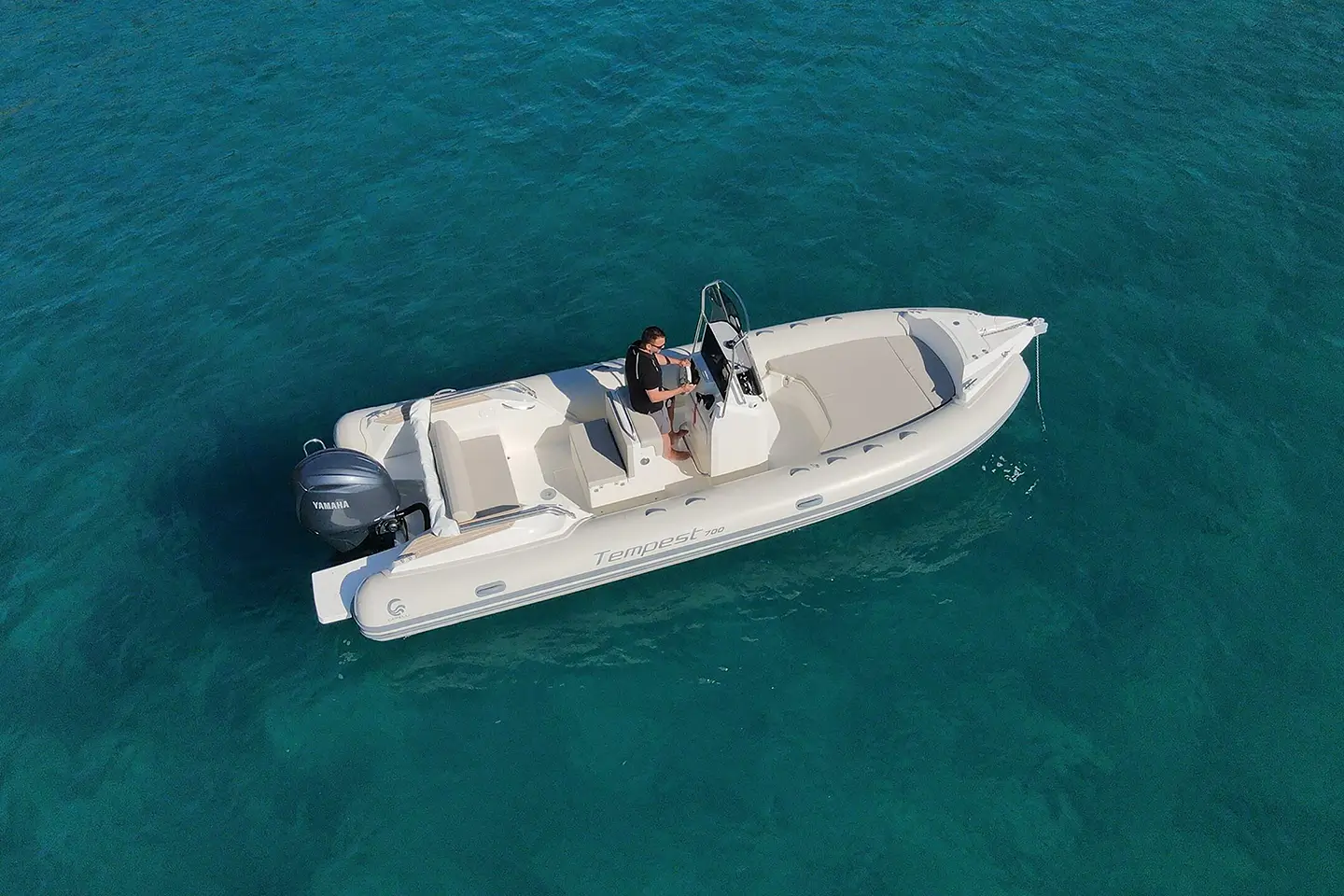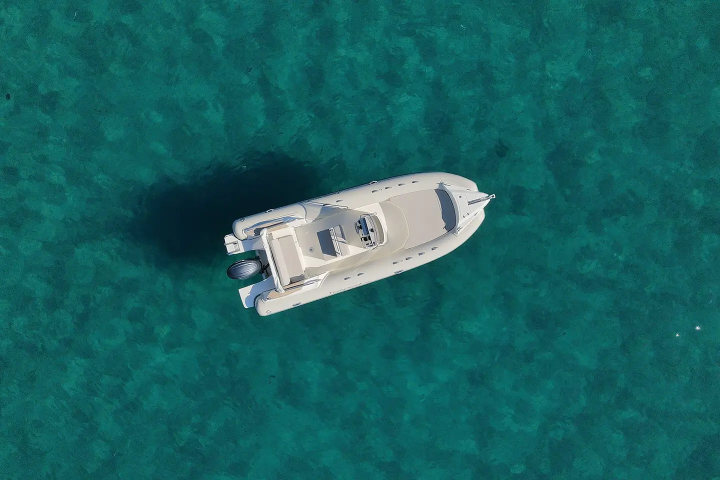 The updated deck layout features a new configuration, with a helm bench facing aft and a rear sofa with a reclining backrest. This setup increases seating at the stern and provides a larger sunbathing area. The aesthetics are inspired by the LUXE range, with coordinated colours that give the boat an elegant and timeless look, featuring ivory fiberglass, ivory perlage tube, and light beige upholstery. The redesigned steering console includes a tall, protective windshield, a spacious instrument panel that accommodates displays up to 16”, and additional storage space. The expansive bow sunpad cushion can be further enlarged with an optional extra cushion, and below it, there is a generous storage compartment.
